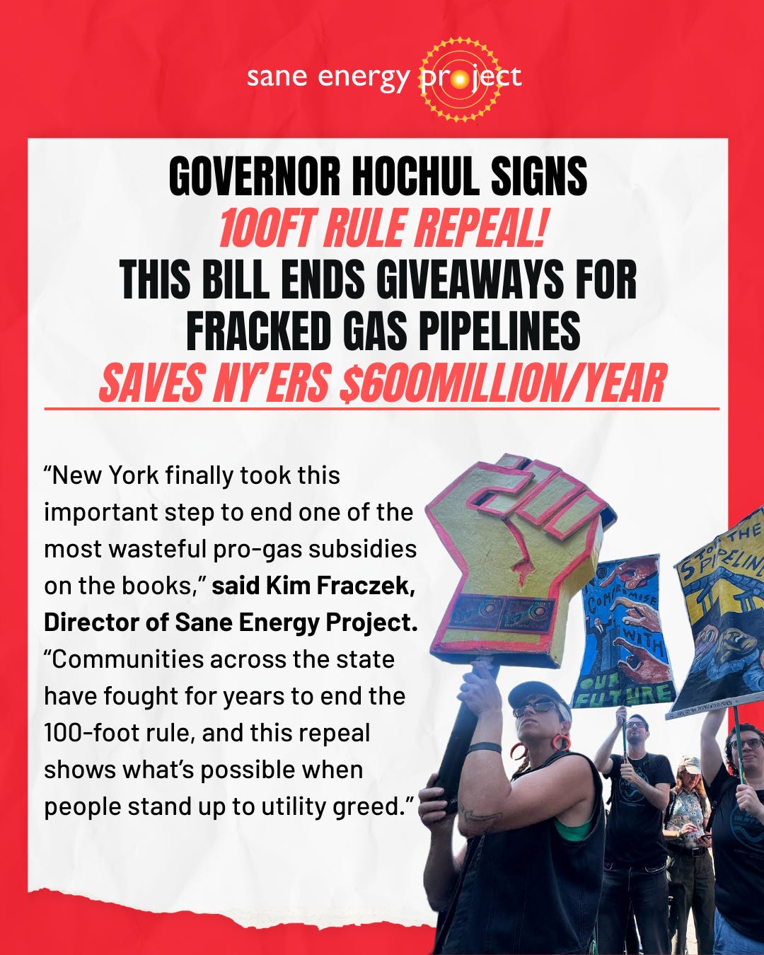 1. Governor Hochul signed the repeal of the 100-Foot Rule (including a one-year implementation delay, which she insisted on), a major pillar of the NY HEAT Act. This bill, the result of a years-long campaign, will help end a rigged system where fracked gas companies receive subsidies for their infrastructure projects. By leveling the playing field for clean, affordable solutions such as heat pumps and weatherization, New Yorkers will save hundreds of millions of dollars each year.