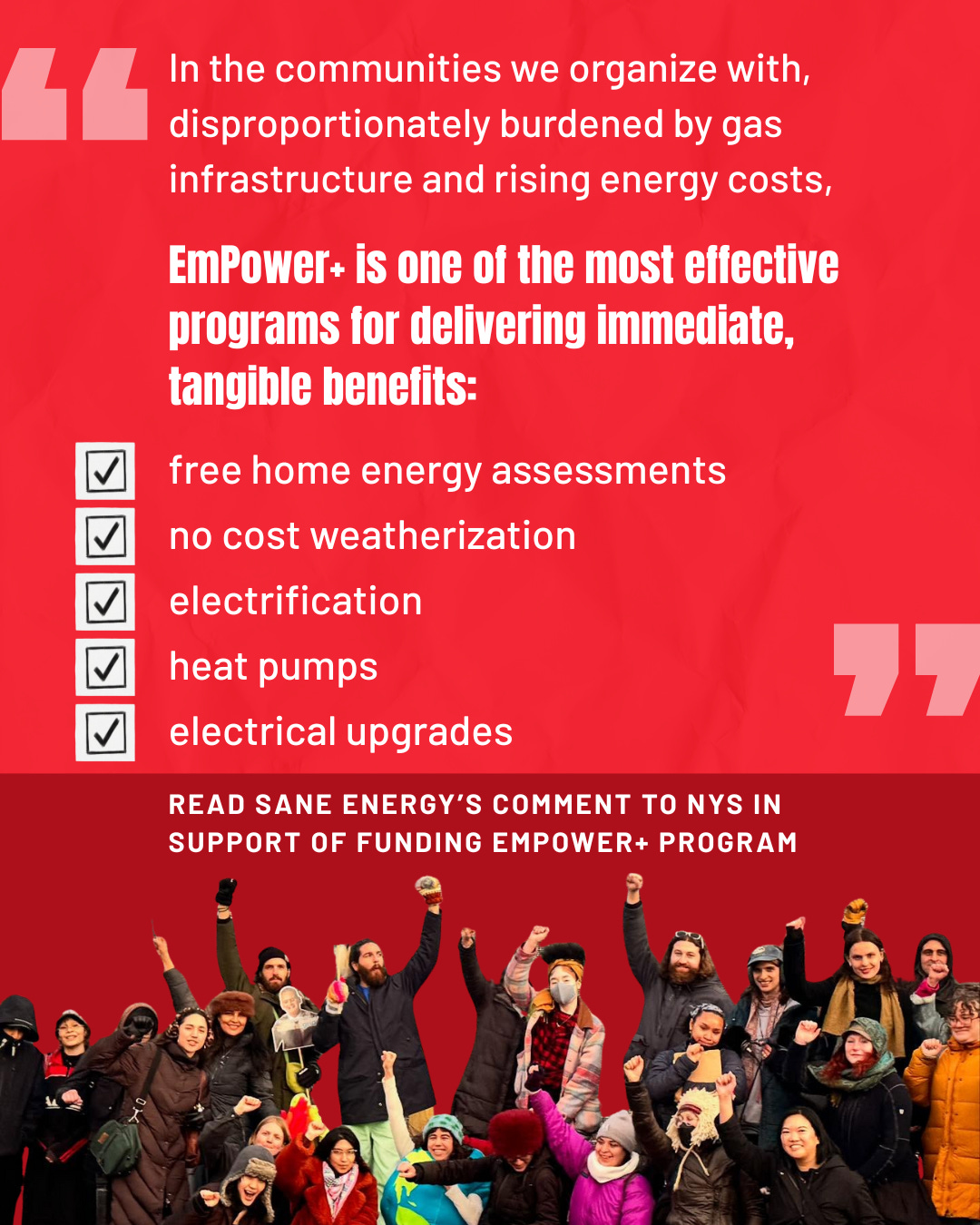3. Thanks to the activism of people like you- NYSERDA, New York’s renewable energy agency, has proposed a big financial boost for EmPower+ starting in 2026. The program provides homes with free energy assessments and upgrades, such as weatherization, heat pumps, and electrical improvements, cutting bills, improving health, and reducing fossil fuel use. Expanding EmPower+ proves that grassroots action can win real climate and affordability solutions. Read Sane Energy’s Letter of Support to NYSERDA.